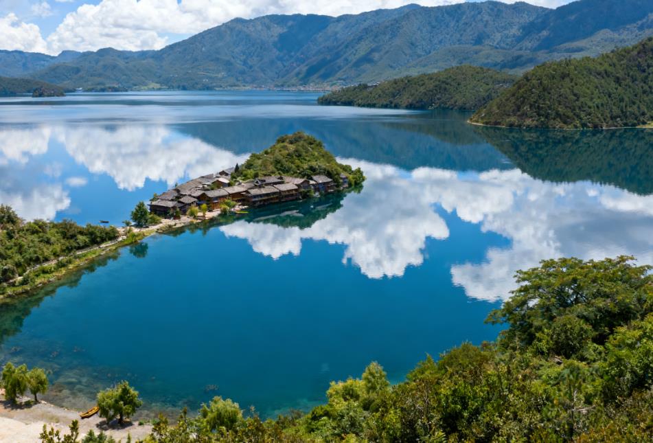 清晨的泸沽湖畔,水性杨花浮在碧蓝的水面上,摩梭人的猪槽船划过时,惊起一群红嘴鸥。湖畔的格桑花从五月开到十月,粉的、紫的、白的,在风中轻轻摇曳,与远处终年积雪的狮子山形成鲜明对比。若赶上雨后,云海如瀑布般从山巅倾泻而下,漫过村庄与森林,只露出几座青瓦木楞房的屋顶,宛如蓬莱仙境。