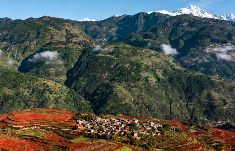 冬季的悬崖村被冰雪装点成水晶宫。藤梯上的冰凌折射着阳光,彝族老人在火塘边讲述祖先迁徙的故事,窗外,苍鹰正掠过冰封的深谷。此时若登上昭觉谷,可见云海在脚下铺展,远处的贡嘎雪山如银色王冠,而近处的经幡在寒风中猎猎作响,将六字真言送往云端。